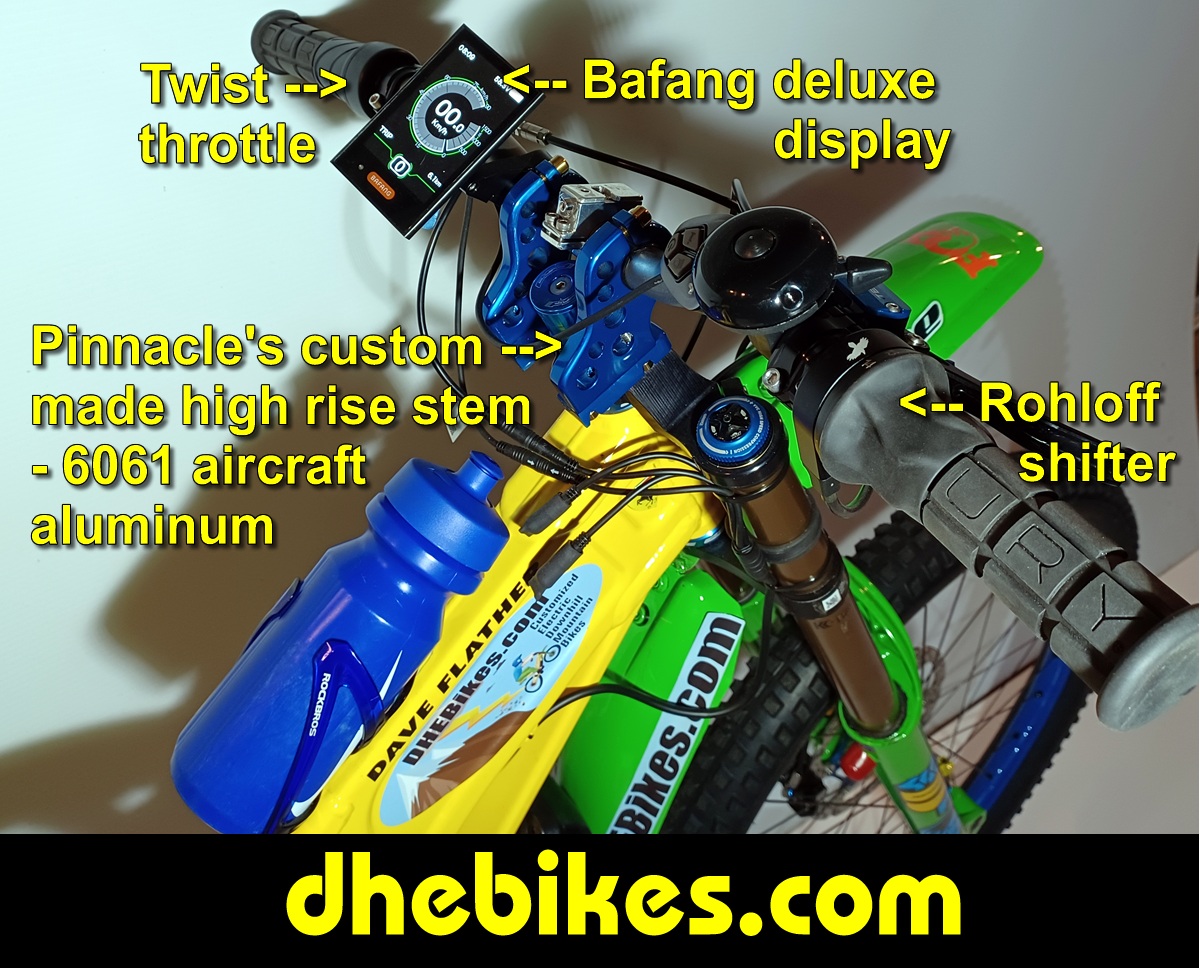 Cockpit view of the 2001 Norco dual suspension custom made electric downhill mountain bike showing the Bafang electric pedal assist deluxe digital display, 1/2 twist throttle, custom made 6061 aircraft aluminum dual clamp high rise DH stem, Risse Racing high drop upper crown for the Fox 40 fork and other parts.