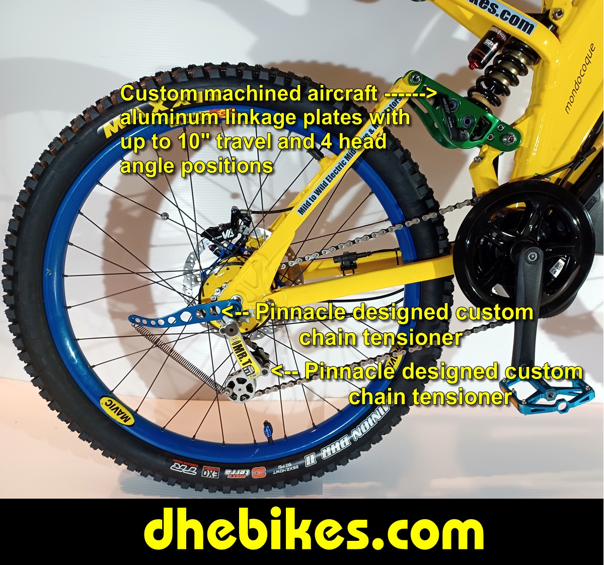 Shown here is my simple 30 gram chain tensioner system as well as the "Mr. T" chain tensioner that I designed. These simple and lightweight tensioning devices have prevented me from ever dropping a chain in well over 60,000 km of riding over the past 25 years - including probably more than 15,000 km of downhill riding and downhill mountain bike racing. Also shown is David